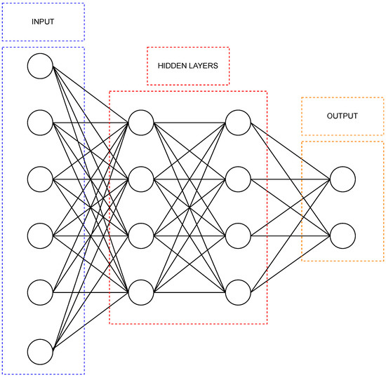 An Artificial Neural Network (ANN) is a non-linear function approximator. It consists of an input layer of neurons and an unspecified number of hidden layers and a final output layer. Each neuron performs a weighted sum of its inputs, and finally, it applies an activation function that determines the output of each neuron. When the activation function is a Sigmoid function, the single neuron works as a Logistic Regression without the classification threshold. Figure 3 shows a general structure of an ANN with the input layer, two hidden layers, and the final output layer whose structure strongly depends on the task it should perform. The main common architecture is the feed-forward ANN where each neuron is linked to every neuron in the next layer but without exhibiting any intra-layer connection among neurons belonging to the same layer. Each layer can be seen as a partial approximation of the final function.