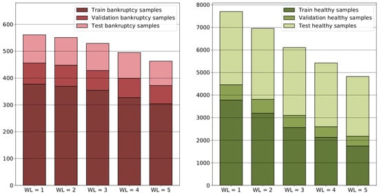 Figure 4 shows the distribution of the two classes of bankruptcy and healthy samples for the training, test, and validation by selecting different Window Lengths (WLs).