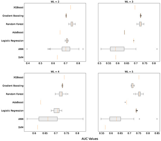 The four box-plots show the locality, spread, and skewness groups of AUC values achieved on the validation set for each model in the same conditions as for the first case by varying the WL parameter.