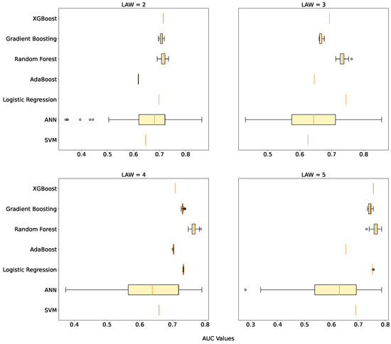 The box plot shows the locality, spread, and skewness groups of AUC values through their quartiles achieved for each model in 100 different runs with a different balance training set. The reported AUC values (horizontal axis) are related to the case of WL = 1 where all models use only variables from the last year. The lines (whiskers) extending from the boxes indicate the variability outside the upper and lower quartiles. The orange line represents the median between the first quartile and the third quartile. The circular points (fliers) are those located past the end of the whiskers.