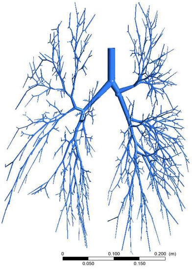 Particulate matter emission into the atmospheric air is a global health challenge, and emissions are increasing every day [1]. The increasing rate of respiratory health patients is evidence of the health hazards of atmospheric pollution [1]. Precise knowledge of atmospheric aerosol transport and deposition to the airways of the human lung is essential for health assessment and drug delivery purposes [2]. To date, researchers have employed wide-ranging approaches (in silico, in vivo and in vitro) to understand aerosol transport to the airways. The computational fluid dynamics (CFD) approach is the most popular method for airflow and particle transport in airways [3,4] and most of the studies to date used CFD for aerosol transport in airways. Almost all of the published literature considers the upper airways and analyses aerosol transport in airways [5,6,7]. Cheng et al. [8] performed an in vivo study for ultrafine aerosol transport and deposition in human oral and nasal airways. The study employed 10 adult healthy males cast for the analysis. The in vivo study reports the smaller cross-section area of the extrathoracic airways and that the complex airway shape influences the overall ultrafine particle deposition pattern. Later, Zhang et al. [6] studied ultrafine and microparticles transport in an idealised mouth–throat and upper airways. The symmetric three-generation (G0–G3) model investigates the aerosol deposition pattern for different flow rates. The study reports a higher deposition concentration of the aerosol at the carinal angle region of the airways than in the bifurcating airways. In 2008, Zhang et al. [9] considered a 16-generation airway model and analysed the nanoparticle’s transport and deposition. The study did not consider the asymmetric whole lung model for the 16 generations, and several 3-generation models were used to analyse the particle deposition.