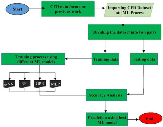 The procedure adopted in the present work is presented in the flowchart, as shown in Figure 2. Firstly, we collected the CFD data from our previous work for the ML step. The goal of using MLAs with CFD simulations was to decrease the computational time and, thus, the computational cost. The four MLAs used in the present analysis are k-nearest neighbours (k-NN) [16], Gaussian process regression (GPR) [17], random forest (RF) [18] and multi-layer perceptron (MLP). The best MLA among all was then used for optimisation. MLAs application requires hyper-parameters tuning to obtain the optimum result. The GridsearchCV tool was used for obtaining the optimised values of the important parameters. It is available in the Scikit-learn library [19].