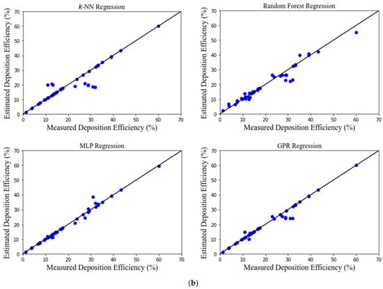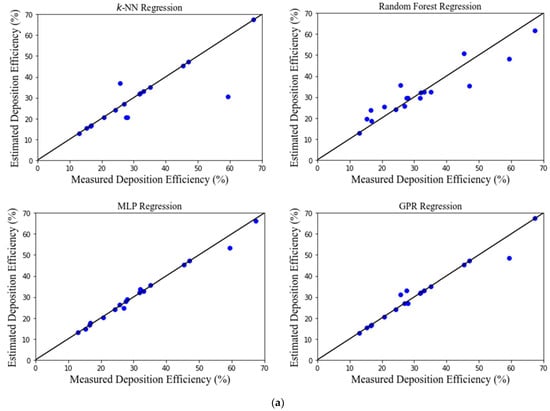 Figure 3 shows the performance of developed MLAs. There is a good agreement between the estimated and the measured (from CFD simulations) values for most MLAs. The deposition efficiency was estimated extremely well by all the MLAs. The MLP and GPR models performed exceptionally well, while the RF and k-NN models performed reasonably.