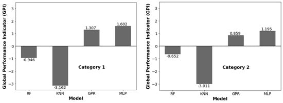 Scaled values of statistical parameters (0 to 1) and GPI and ML model ranking are depicted in Table 6. Figure 4 represents the overall GPI estimation. The MLP model ranks 1st with GPI = 1.603 then the GPR model with GPI = 1.308, followed by the RF model with GPI = −0.946. The MLP model shows the best performance among all the models in category 1. In category 2, the MLP model again shows top performance, followed by the GPR and RF models. Thus, we selected the MLP model for further analysis.