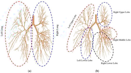 Definition of the local regions of the 17-generation airway model: (a) left and right lung, and (b) five different lobes.
