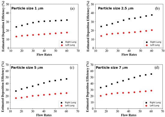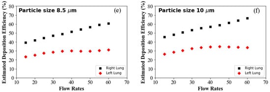 Figure 6a shows the DE for 1 µm diameter particles at different flow rates. The overall DE of 1 µm particle in the right lung is higher than in the left, irrespective of the flow rates. For micron-sized particles, inertia plays an important role in overall transport and deposition. At high flow rates, larger particles cannot follow the air path line and deviates from the air streamline. At high flow conditions, once the particles are displaced from the original pathline, they touch the airway wall and become trapped on the highly viscous surface of the airway wall. However, aerosols can follow the air streamline at low flow inlet conditions, minimising the overall DE at the upper airways. The right lung anatomical diameter is higher than the left lung, and the right lung consists of three airway lobes while the left contains two lobes. The complex anatomical shape and branching structure, higher flow distribution to the right lung, flow rates and particle inertia influence the overall DE at the right lung. The DE for the right and the left lung increased with the flow rates, which closely aligns with the CFD data, and it also satisfies the general aerosol deposition hypothesis in airways. Figure 6b–f show a similar trend of DE for different diameter particles. Figure 6d–f show the DE for 7 µm, 8.5 µm and 10 µm diameter particles, which is significantly higher than the smaller particles. Larger diameter particles mean the particle inertia will be higher, and the impaction mechanism is dominant for larger particles. At high flow condition, the inertial impaction became more dominant for the larger diameter particles and influenced the overall DE.