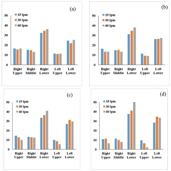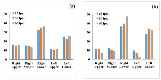 The comparison of DE in different lobes with respect to flow rate and particle diameter for particle sizes of 2.5 µm and 7.5 µm is shown in Figure 7. For a 2.5 µm diameter particle, the DE is higher at the right lower lobe and lower at the left upper lobe irrespective of the deposition parameter. It is also noticed that the DE of 2.5 µm particles at the right lower lobe increased with the flow rate. The overall DE at the right and left upper lobes is lower than the right and left lower lobes. The upper lobes’ branches are in the upward direction and opposite to the gravitational force, while the lower lobes are in the downward direction. Micron-sized particles mostly travel downward due to the high inertia, which transports fewer aerosols to the upper lobes of the airways, and less deposition occurs at the upper lobes. Figure 7b shows the 7.5 µm aerosol DE at different lobes, and a similar trend is observed at various lobes. At the flow rate (15 L/min), DE at the left upper lobe is different from other lobes. The overall DE at the left upper lobe is higher for low flow rate and lower for high flow rate. At a high flow rate, larger diameter particles deviate from the streamline and transport to the lower airways, while at a low flow rate, more particles transport to the upper airways. The overall DE at the right middle lobe shows a similar trend for 2.5 µm and 7.5 µm particles.