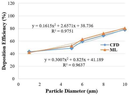 Figure 9 presents the comparison of DE for the 17-generation model. The ML prediction data is compared with the CFD measurements at a 25 L/min flow rate. The overall DE from the ML model shows a good agreement with the CFD data. A second-order polynomial equation is developed from the trendline of the CFD and ML DE curves. The R2 value for the CFD and ML trendline is 0.9637 and 0.9751, respectively. The curve fitting indicates the accuracy of the ML model.