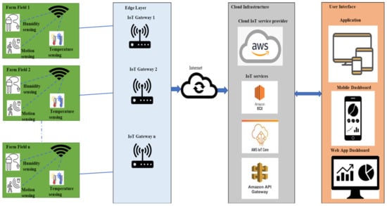 A typical cloud-enabled IoT smart agriculture is shown in Figure 1. The cloud-based architecture is comprised of the IoT device connected to the farms and agricultural land to monitor various physical conditions such as fertilizer usage, proper seed spilling, weather state, food growing quality, and storage environment conditions. Various sensors such as temperature, humidity, and pressure are used to monitor the farming condition. The IoT devices are connected to the common gateway to pass the state information to the third-party cloud vendor, who provides the product services. The gateway can be a generic or dedicated router designed for the smart farm. The cloud provider can be any primary service provider such as AWS, Google Cloud, Microsoft Azure, or a self-managed cloud. The gateway is connected to the cloud resources to process the IoT device requests.