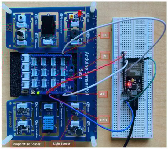 Figure 3 displays the Arduino microcontroller used to control and connect to the IoT sensing devices. The temperature sensor and humidity and light sensor are connected to the microcontroller, and the microcontroller supports a Wi-Fi connection to communicate with cloud services. The sensors can be considered as agriculture application end devices. As shown in Figure 3, the temperature and light sensor positive terminals such as A3, and D3 are connected to the microcontroller PINS. The negative terminals are grounded to prevent short-circuiting issues. The microcontroller is power supplied with 5V, which is shown in Figure 3 with a red wire connection.