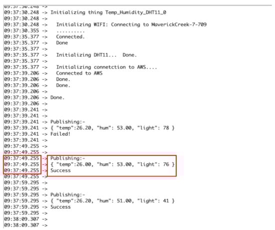 As shown in Figure 4, the sensing device’s status will be monitored using the desktop application. The Arduino controller is connected to the laptop via wired communication. The sensor measures real-time activity such as temperature and light in the farming. We installed the Arduino software application on the laptop machine to run the C code on the Arduino kit. The code comprises the WIFI connection credentials; AWS IoT Core connection requirements such as Client ID, AWS Host URL; and the MQTT topic name and the programming logic to read the sensor data as an MQTT topic and publish the MQTT topic in the AWS IoT cloud using the network connection. The code is dumped on the Arduino micro-controller to run the application and post the data in AWS IoT Cloud. Figure 4 displays the print statements indicating the Arduino kit connected to the author’s home WIFI network “maverickcreek-7-709” and initiating a connection to the AWS Cloud. Once it is connected to the AWS, the sensor data is published as an MQTT topic with values temperature: 26, light: 26, and humidity: 51.The data publish-success message can also be seen in the Figure 4.