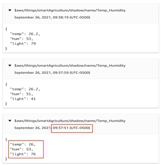 The MQTT publish messages and can also log in to the AWS IoT Core. Figure 5 displays the published IoT sensor data in the AWS Cloud. As seen in Figure 4 and Figure 5, the data publication time in the IoT core cloud is 2 s. The highlighted red boxes in Figure 5 indicate the timestamp and sensing temperature, humidity, and light values in the Arduino kit environment.
