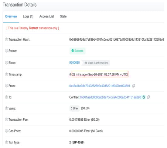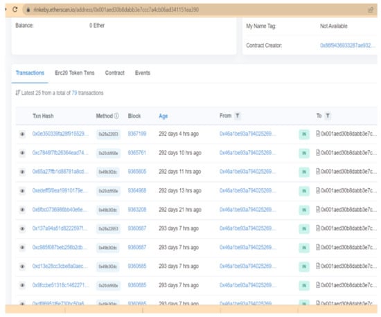 The experimental transaction performed on the rinkeby network can be seen publicly for reader understanding. Figure 8 displays the list of transactions stored in the Ethereum test network. The from and to address, transaction hash value, and the block ID can be seen for each transaction. The details of the transaction can be explored by browsing the URL “https://rinkeby.etherscan.io/address/0x001aed30b8dabb3e7ccc7a4cb06ad341151ea390 (accessed on 19 August 2022)”.