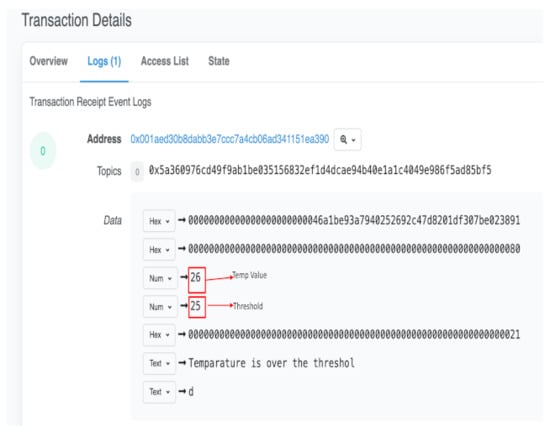 Figure 7 indicates the data field format in the Ethereum transaction. The sensor threshold value, current value, and alert message are stored in the data transaction. This data will not be tampered with and will be stored securely in the blockchain. The boxes highlighted in red clearly show that the temperature value of 25 does not exceed the threshold value of 26.