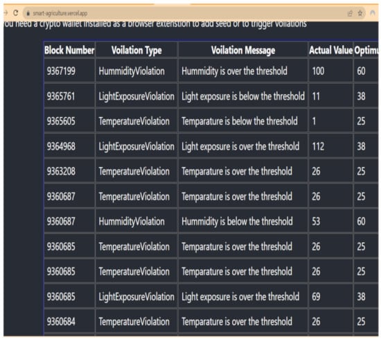 We developed the web frontend application to receive the agriculture security alerts such as anomaly and device-status alerts. The frontend application displays the alert notifications in the form of Ethereum transactions. Figure 9 displays the alert notifications with details about the sensor data and policy violations. For example, block number 9363208 in Figure 9 notifies the farmer regarding the temperature variations in the monitoring environment. When the temperature exceeded the threshold value, the policy violation message was displayed on the frontend test web application. We used vercel web platform to develop our test web application. The web URL “https://smart-agriculture.vercel.app (accessed on 19 August 2022)” shows the live experimental data obtained from our smart agriculture end-to-end application.