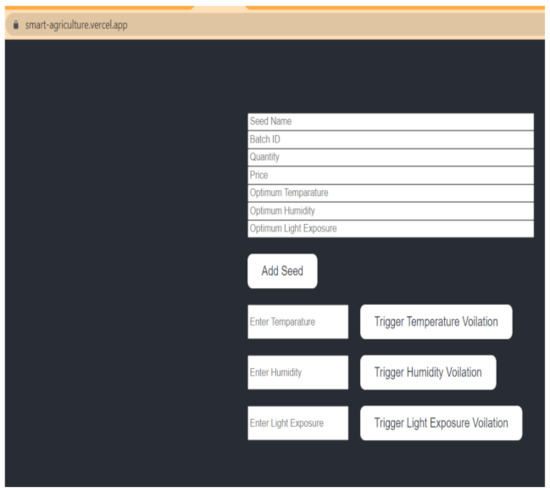 A user might also want to update the transactions using the frontend application. For instance, the user needs to store the sensing-device anomaly data for future reference purposes. We integrated this functionality into the frontend web app to update the violated sensing data conditions into the blockchain. Figure 10 shows the frontend web application with interactive options to update the transactions in the Ethereum test network. This feature helps the farmer or the web-application operating user to control the blockchain platform used for agriculture security monitoring.