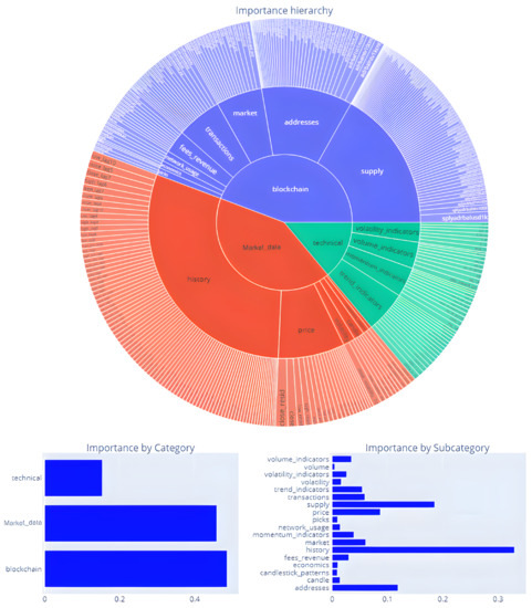 The features are aggregated into the corresponding category and subcategory according to the hierarchy reported in Table 2. We considered a large variety of features among the most established for cryptocurrency trading (according to [12]). To foster the reproducibility of our work, both the analyzed dataset and the project code are publicly available for research purposes (https://dbdmg.polito.it/dbdmg_web/index.php/leveraging-explainable-ai-to-support-cryptocurrency-investors/, accessed on 1 August 2022). A detailed description of the dataset features is available at https://dbdmg.polito.it/dbdmg_web/wp-content/uploads/2022/08/features.xlsx, accessed on 1 August 2022.