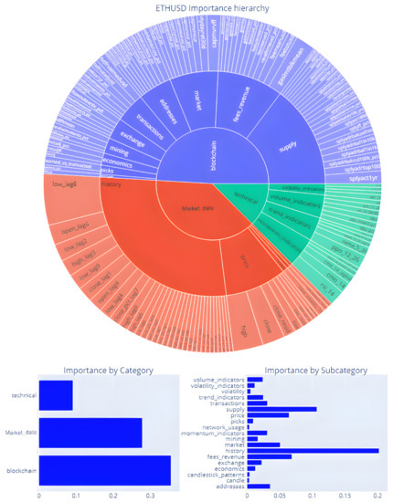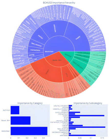 Figure 8, Figure 9 and Figure 10, Figure 11 report similar pieces of information for BCHUSD and ETHUSD, respectively. We can notice that some of the top features are shared between BTCUSD and BCHUSD, whereas ETHUSD is more affected by other blockchain-related features. Most of the top features categories are shared among all the three considered features.