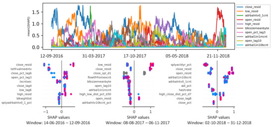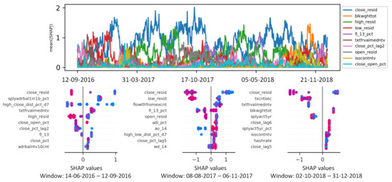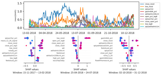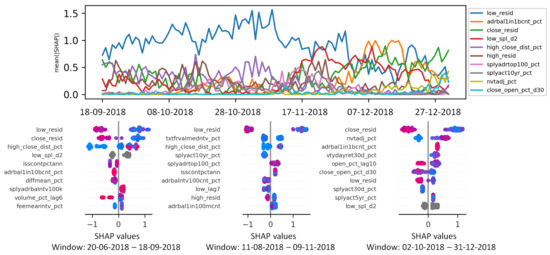 For example, according to the left hand-side bee-swarm summary plot in Figure 1, close_resid, volume_pct_tag8 macd_12_26, and low_close_dist_pct_d30 are the only features obtaining a significant number of positive Shapley values during the training window from the beginning of February 2017 to the end of July 2017. Comparing different summary plots over time can be useful, for instance, for detecting temporal changes in the ML decisions. Traders can manually verify and possibly revise the current trading strategy based on the alarms triggered by the eXplainable AI tool.