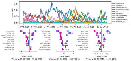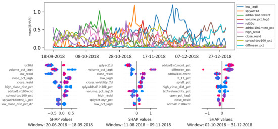 The charts in the bottom part of Figure 6 report the Shapley values computed for three representative windows of size W (i.e., the ones associated with the first, the middle, and last date of the considered evaluation period). Each chart reports, for the top-10 most influential features, the Shapley values associated with the predictions made within the considered time window (i.e., one point in the plot per prediction). The absolute Shapley value indicates the strength of the feature influences. Its sign indicates whether the value of the feature positively or negatively impacts on the prediction of the Uptrend label. If the Shapley values associated with a feature are close to −1 or 1, it means that the feature affects the prediction more significantly than the other ones. As for the SHAP series plot, the variability in the summary plots over time strongly depends on the underlying market conditions. For example, in the last quarter of 2018, AI model predictions turn out to be primarily influenced by the historical price series, whereas in the previous quarters of 2018, the influence of blockchain-related features is more evident. Based on these results, domain experts can investigate more in depth the reasons behind such a strategy change to judge the reliability of the algorithmic trading approach. More specifically, in the last quarter of 2018, all the BitCoin-related plunged, and such an evident market downtrend is prevailing for algorithmic trading systems.