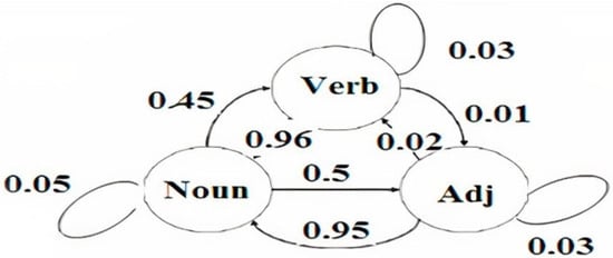 Assume we have three states: verb, noun, and adjective, as indicated in Figure 5. Table 4 shows the transition matrix that shows the transition from one state to another. The transition probability from verb to adj is 0.01 and from adj to verb is 0.02.