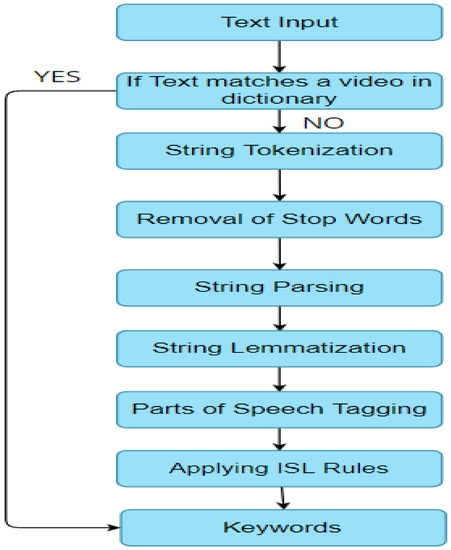 Figure 6 shows the natural language model’s architecture. If the text input which is given as input to the model matches a video in the database, then the input is given as the keyword; otherwise, the input text is processed through the various NLP technologies and then the keywords are generated. Each part of the technology is discussed in more detail in the heading “Methodology”.