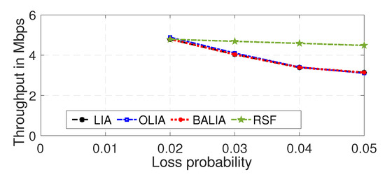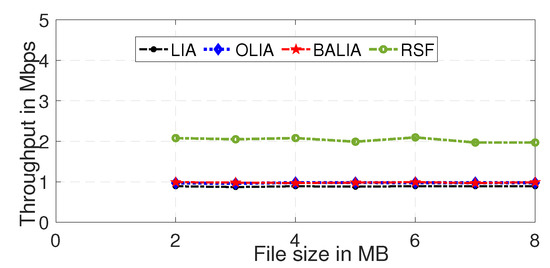 Figure 7 depicts the throughput performance when downloading a file with a size of 10 MB. The results show that, with increasing packet loss, the throughput achieved by the existing MPTCP algorithms decreased. In contrast, the RSF-LB algorithm outperformed them and provided robust performance, even with increasing channel errors. This was because most existing algorithms significantly reduced congestion windows after detecting packet losses. However, the proposed RSF MPTCP could dynamically determine the best way to adjust the congestion windows using the balanced pricing approach.