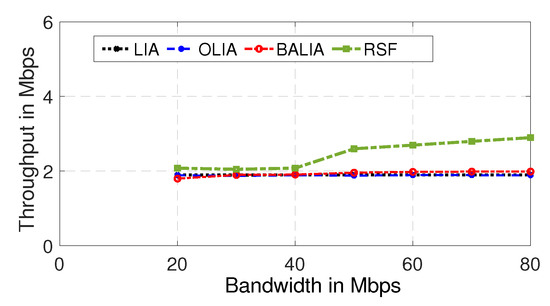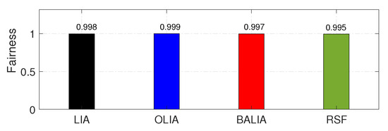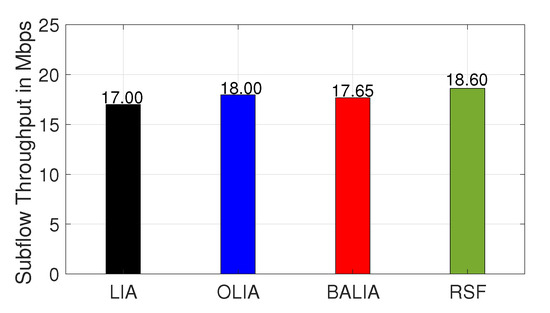 Figure 10 shows that when RSF-DB MPTCP was used, the throughput achieved by regular TCP flows was comparable to that obtained while competing with the other MPTCP algorithms. However, the corresponding MPTCP connection had much higher throughput. More specifically, when compared to the other MPTCP algorithms, the performance of TCP when competing with cooperative MPTCP flows was slightly lower, but the throughput gain for MPTCP was very high. The throughput gain rose because of RSF MPTCP’s ability to exploit the capacity of both available paths. The reason for the slightly reduced TCP throughput needs further investigation, and this remains for future work. The observation with RSF-LB was also similar.
