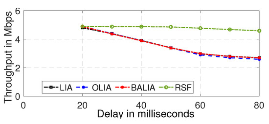 Figure 6 illustrates the overall impact on throughput, which can be summarized as follows. The throughput of all MPTCP algorithms (including RSF) decreased with increasing delay, as expected. However, the decline was quite gradual for RSF MPTCP and quite pronounced for the other MPTCP algorithms.