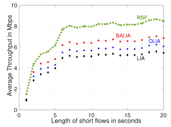 Figure 8 shows the throughput perceived by small flows of different durations. The results indicate the following: The proposed RSF MPTCP was robust in a highly dynamic environment in which MPTCP flows joined and left the system frequently.