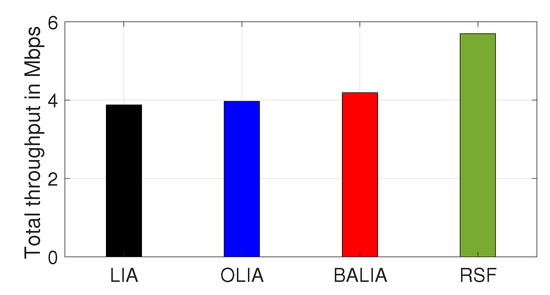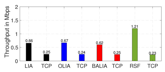 The results obtained by using Scenario 9 are shown in Figure 10. Figure 10 illustrates the throughput perceived by both TCP and MPTCP connections, which demonstrated the following: RSF MPTCP was quite friendly towards TCP while providing better throughput than the other MPTCP algorithms.