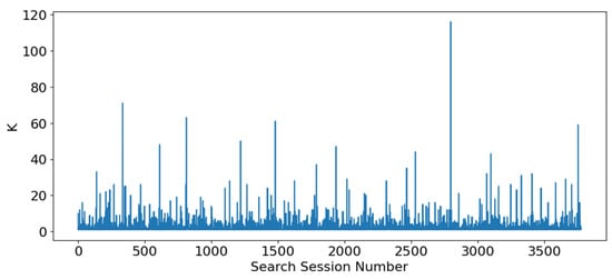 K values for 4000 sessions: during some sessions, many articles are read (K) but in most cases, only a few articles are retrieved. On average, 2.7 articles are downloaded, 75% of the sessions are for three papers or less, some sessions exceed 100 items.
