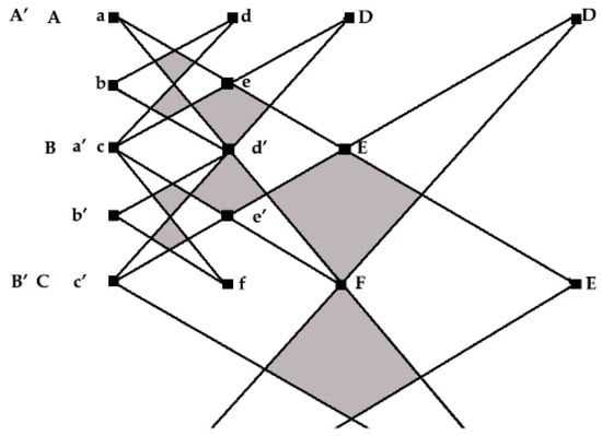 As illustrated by Figure 5 below, GRAPHYP with nodes A, B, C, etc., is built by the addition of graphs of the same shape, and open thus to a self-similar substitution (https://tilings.math.uni-bielefeld.de/glossary/selfsimilar-substitution/ 2 August 2022); this self-similarity characteristic of GRAPHYP [] allows knowledge extraction at any scale and allows operating scalability from perimeters of information processed from operations of addition, subtraction, multiplication and division, which, to the best of our knowledge, has not yet been outlined in graph architectures.