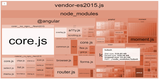 The concept of lazy loading is recommended and will only apply to resources that are not needed all the time. In this way, lazy loading can provide a benefit and speed up page load time. The implementation of new interfaces for the newly created models from the project was pursued. The SuperService model has been implemented, which offers the possibility of arranging super-services in the form of a tree; so, through the SuperService model, a hierarchy of services can be defined according to the necessary order within a project. To improve the code and modules that the application uses, the webpack-bundle-analyzer package has been implemented, which tells us in detail what dependencies a given file may contain after the build process. An image parsed by this package of the vendor.js file can be seen in Figure 4.