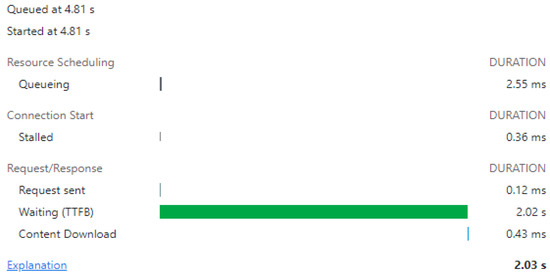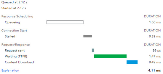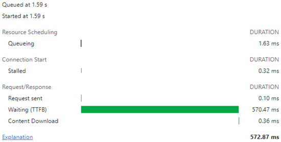 The use of M&S in engineering is well recognized. Simulation technology belongs to the toolkit of engineers in all application domains and has been included in the engineering management body of knowledge. M&S helps to reduce costs, increase the quality of products and systems, and enable their documentation. To ensure that simulation results are applicable in the real world, one must understand the assumptions, conceptualizations, and constraints of its implementation. In addition, the models can be updated and improved using the results of real experiments. Based on this information, the ways in which the user interface can be optimized were analyzed and simulations were carried out at a standard speed without any limitation, a FAST 3G speed, and a SLOW 3G speed. The testing of the interfaces was followed from the point of view of the resources used and the loading and response times. The simulations are presented in Figure 5, Figure 6 and Figure 7, the waiting times being distinctly marked with the green color, the download times for downloading the content are marked with the blue color, the requests and jumps with the gray color.