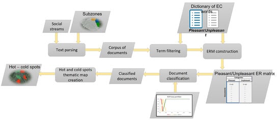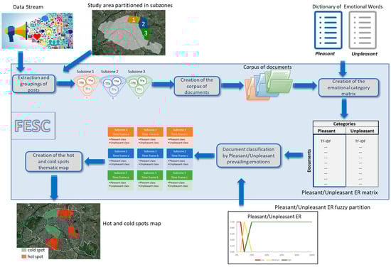 In the preprocessing phase, the partitioning of the study area in subzones is performed; the analyzed period is partitioned in T time frames, and the pleasant and unpleasant ER fuzzy partition is created. After classifying each document, the number of related documents classified with pleasant/unpleasant emotion relevance greater than or equal to the threshold value Ȓ is calculated for each subzone. If this number is equal to the number of time frames T, then the subzone is labeled as a cold or hot spot. Finally, the hot and cold spots thematic map is created.