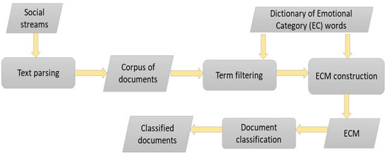 In [], a framework was proposed to classify documents extracted from social streams based on the prevailing emotional category. An architectural schematization of this framework is shown in Figure 3.