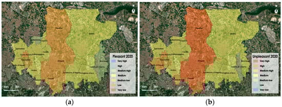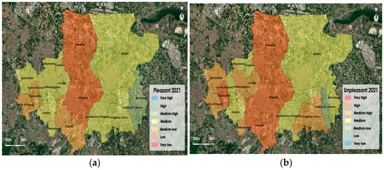 Figure 7 shows the thematic maps of the pleasant (Figure 7a) and unpleasant (Figure 7b) emotion categories’ relevance measured in 2021.