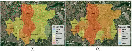 Figure 8 shows the thematic maps of the pleasant (Figure 8a) and unpleasant (Figure 8b) emotion categories’ relevance measured in 2022.