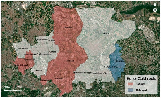 The northeastern area of the province of Naples is covered by two hot spots. The largest is located along the central area of the study area and covers the extension of the municipalities Afragola, Caivano, Casavatore, and Casoria; the other is located to the southwest and covers the extension of the municipalities Casandrino, Grumo Nevano, and Melito di Napoli. The study area is also covered by a cold spot located to the southwest and including the municipalities of Brusciano and Castello di Cisterna.