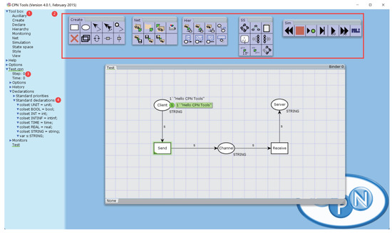 The CPN Tools is a special simulation system that uses the language of Petri nets for model representation. The tools were developed by Aarhus University in Denmark based on Design/CPN, and the Graphical User Interface (GUI) was designed using good human–machine interface technology, which not only enables editing, simulation, and analysis of colored Petri nets, but also supports the Timed Colored Petri Nets (TCPN) and the Hierarchical Colored Petri Nets (HCPN). With the help of CPN Tools, users can easily model, simulate, and analyze parallel systems [25,26]. The CPN Tools proposes a very powerful class of Petri nets for model description. TCPN exploit the model’s notion of time to represent the duration of actions in real-world objects. HCPN provides the construction of complex models. In CPN Tools, the model description language constitutes a combination of two programming languages, including Petri net graphs and CPN ML. In addition to state space generation and analysis, it offers incremental syntax checking and code generation functions for network development. Analyzing the state space reports will enable a thorough security examination and assessment of the build models.
