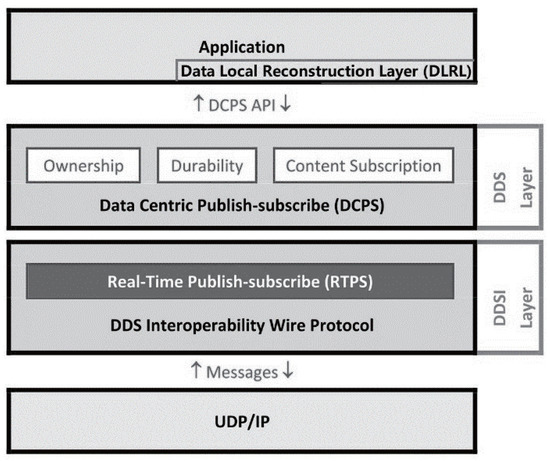 The OMG DDS standard consists of the DDS Interoperability Wire Protocol (DDSI) layer and the DDS layer. The DDSI layer specifies the network transport layer and the DDS layer specifies the data center publish–subscribe behavior and DDS API [31]. Figure 3 shows the stack view of the OMG DDS standard architecture [32]. The DDS specification is divided into two layers [33]: one is the Data-Centric Publish–Subscribe (DCPS) layer [34], and the other is the Data Local Reconstruction Layer (DLRL). The DCPS layer is the core and foundation of DDS and provides the basic services of communication; the DLRL layer abstracts the services provided by the DCPS layer and establishes the mapping relationship with the underlying services in the DLRL layer.