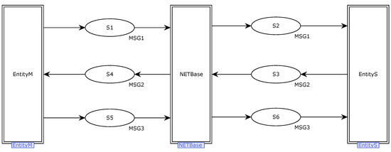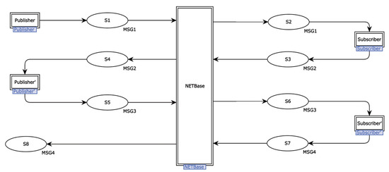 Figure 6 illustrates the mid-level protocol design, which has five alternative transitions and six places. When the two parties establish interaction, the alternative transition Publisher on the left describes the process of participant M establishing connection information to participant S, and the alternative transition Publisher’ describes the process of M processing and replying to the connection information. The middle NETBase describes the communication process of the transmitted information in the network channel. The alternative transition Subscriber on the right describes the process of S processing and replying to the connection information. Substitute transition Subscriber’ describes the process of S’s processing and comparison of security data.