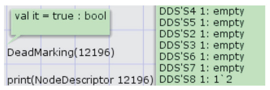 The security evaluation of the new scheme model is compared with the one prior to the improvement. Table 6 presents the state space data of the three attack models before and after improvement. We can find that the number of nodes increases due to the timestamp and verification key consistency steps introduced in the data transfer process. From the table, we can see that the dead node of REY-ATK has been reduced from 2 to 1. By writing a query function to query 12,196 nodes, it shows that this is the termination state of the protocol, which is in line with the expected result. Among them, DeadMarking() is used to judge whether the mark of the specified node is dead, that is, whether there is an enabled binding element. If it returns true, there are no enabled binding elements, which is the protocol termination state. NodeDescriptor() is used to print the actual state of the node, it can be seen that the Num in S8 is increased by 1, indicating that the protocol operation is completed, as shown in Figure 22.