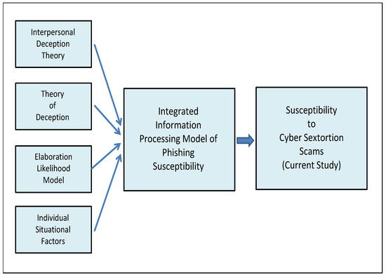 Social engineering techniques that involve cyber sextortion (and phishing) utilize strong elements of both deception and persuasion []. The perpetrator of a cyber sextortion scam, for example, will both attempt to deceive their victims into believing that they are in possession of sexually explicit material involving their victims when they are not in possession of such material, and simultaneously attempt to persuade their victims into doing something such as provide them with monetary rewards in exchange for not distributing the sexual material to the public or to friends and family. As such, a number of theories of deception and persuasion have informed the academic literature on phishing susceptibility and thus the current study on cyber sextortion scams. A diagram showing how each of the theories and models relates to the current study is shown in Figure 1.