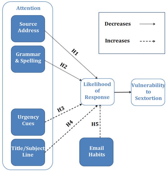 Existing knowledge of phishing attacks allows the prediction of design features of phishing emails and which personality characteristics of the victims who receive them influence victims’ likelihood of responding to these emails and hence become susceptible to phishing attacks. Unfortunately, the same cannot be said for cyber sextortion attacks. Due to the fact that sextortion attacks have been dramatically understudied, little is known about what influences victims’ susceptibility to them. Using the email cues identified in the IIPM as influencing susceptibility to phishing attacks (email source, grammar and spelling, urgency cues, and title/subject line) psychological and cybersecurity theories and techniques to investigate this phenomenon are applied to pave the way for future research and an understanding for how these attacks can be effectively mitigated. The aim of this study is to extend our understanding of cyber sextortion by using our current knowledge of the research literature surrounding social engineering attack-based techniques such as phishing to investigate the effects of message-related factors on cyber security behavior and susceptibility to cyber sextortion attacks. Hence, the following hypotheses will be tested. A diagram of the study’s hypotheses is presented in Figure 2, showing how paying attention to each design cue within sextortion emails is expected to influence the likelihood of responding to these emails, and hence of influencing susceptibility to cyber sextortion attacks.