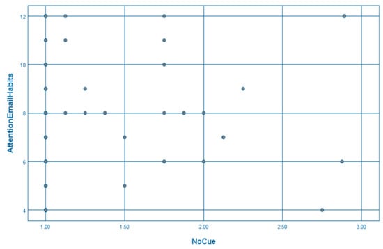 A number of correlational analyses were conducted between susceptibility scores for each of the email design cue conditions and participants’ scores on each of the email habit categories measured by the modified version of the SRHI (general email habits, security email habits, and attentional email habits). As email habits may influence susceptibility to cyber sextortion attacks, correlational analyses were conducted to gather foundational information that might help account for possible discrepancies in measuring the effect of attention to specific design cues within cyber sextortion emails on participants’ susceptibility to cyber sextortion attacks. Spearman’s rank correlation coefficient (Spearman’s rho) was used for the analysis because it does not require the assumption that scores for each correlated variable be normally distributed [], and since the susceptibility distributions for each email design cue condition departs from normality, Spearman’s rho was considered the most appropriate correlational measure for the current analysis. A visual inspection of scatterplots also indicated some evidence of heteroscedasticity (see Figure 3 and Figure 4), meaning that results should be interpreted with caution.