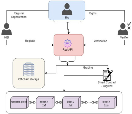 The first is the role administrator (RA). This participant is responsible for registering an organization (Higher Education Institution [HEI], Verifier) in the platform and for providing it with the necessary access to the Rest API, through which all transactions are made. In addition, the RA is the owner of an off-chain database where reference information about participants, students and graduates is stored.