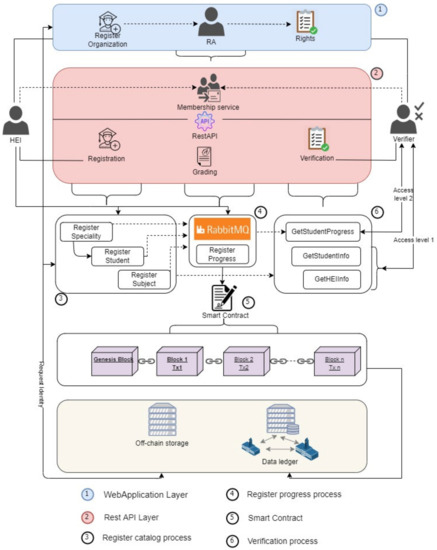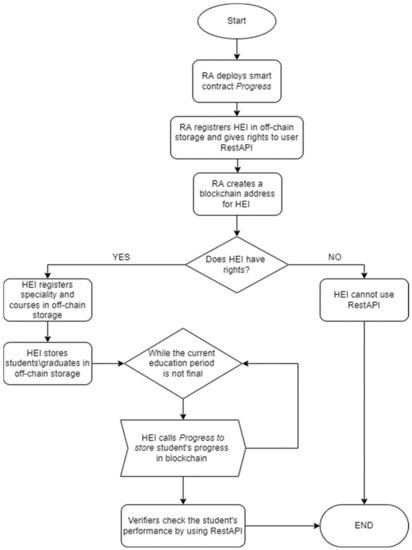 The interface between the participants and the blockchain is implemented by a single smart contract created by the RA. This smart contract is called “Progress,” and it guarantees that a university with the appropriate access level in the platform can record events only in relation to its students. To correctly identify the university, the RA creates special accounts in the off-chain database to connect to RestAPI, as well as in the blockchain platform for making a transaction.