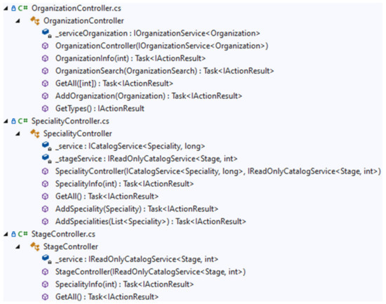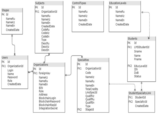 In the first stage, a record about the organization (university or examiner) is formed in this database, as shown in Figure 5. An account is created based on the results of the organization’s registration. Then, the university (a new organization in the database) initiates the registration process of its educational programs. Moreover, the university must compare them with the corresponding training stages, which are constant in the database. The next step is for the university to register the entire compulsory and elective courses of this OP. In the last stage, the university registers its contingent of students in this database. The methods for registering reference data are organized in such a way that, when a record is added for all the listed entities, they return off-chain database identifiers, which can be stored in the learning management systems of universities. These identifiers serve as input information when making a transaction in the blockchain database.